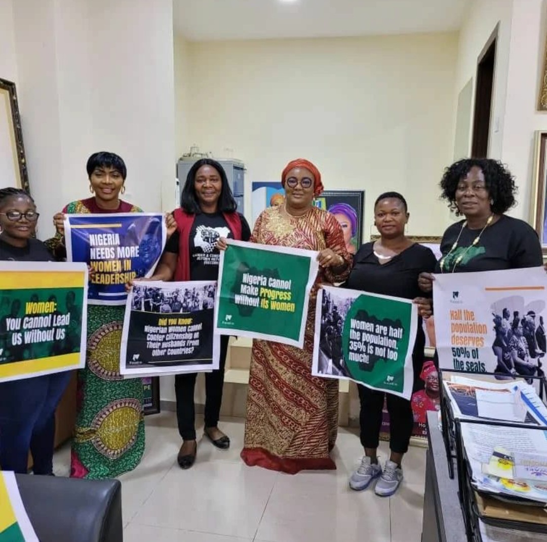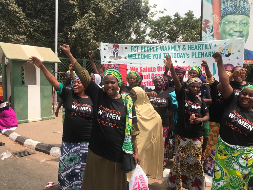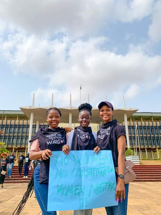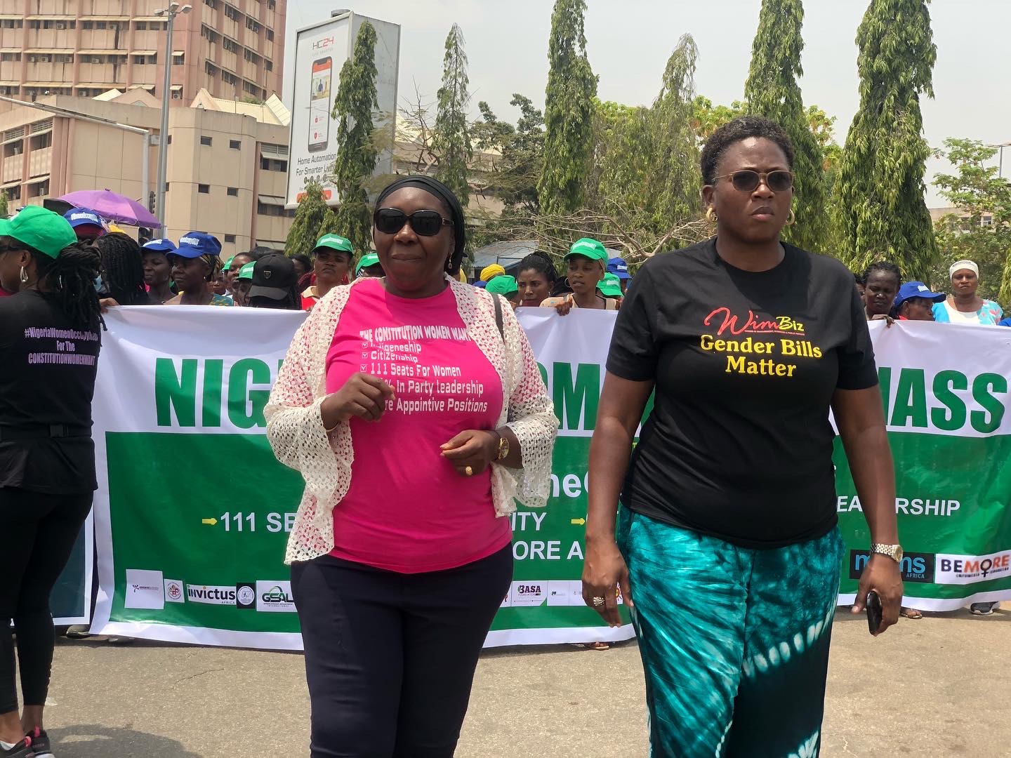 People: Barr. Ebere Ifendu, President WIPF; Dr. Hansatu Adegbite, Co-founder WIMBIZ; Nigerian women during the #nigeriawomenoccupynass protest